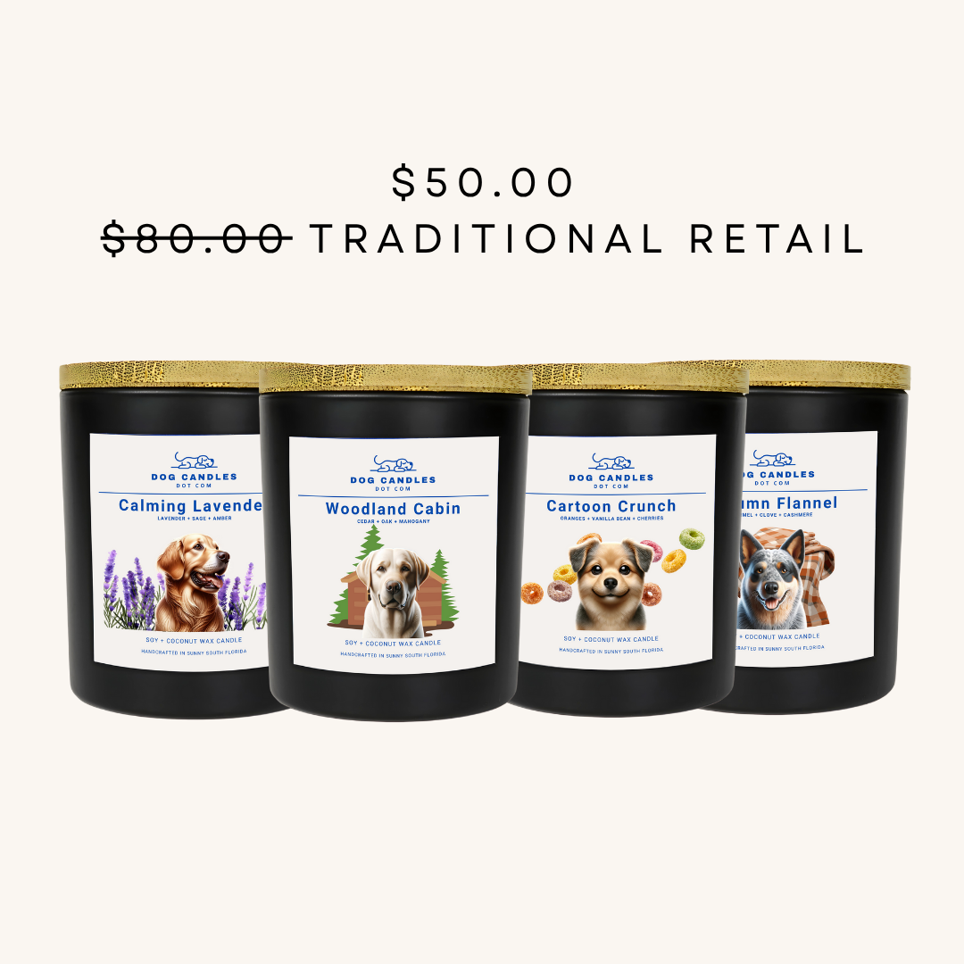 Try our Scent Sampler Pack, 4 Candles, Just $50 with Free Shipping!